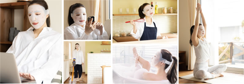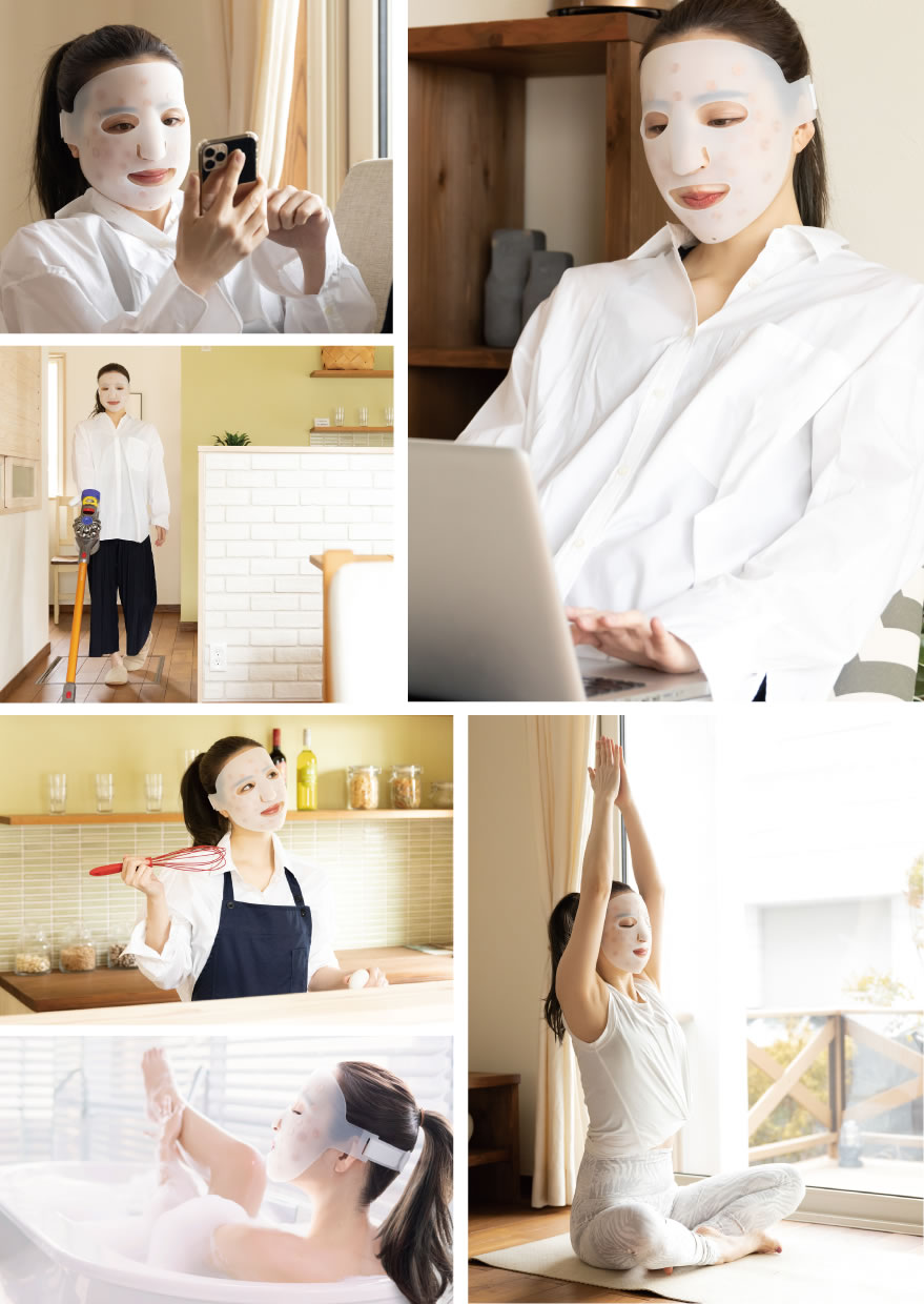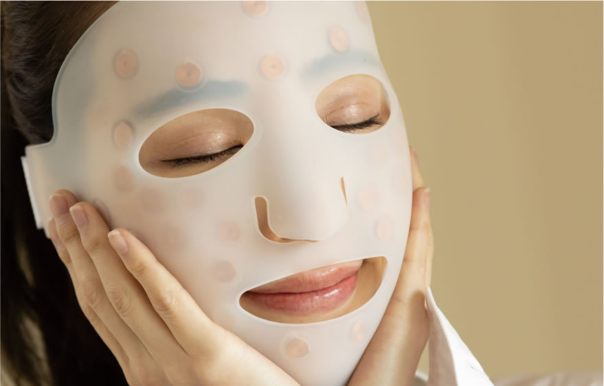 装着後、マスクの上から両手の手のひらで、 おでこ-頰-あごまで顔全体を軽く押さえるハンドプレスを、 20~30秒。続いて、1〜2分間、フェイスマッサージしていただくと効果的です。